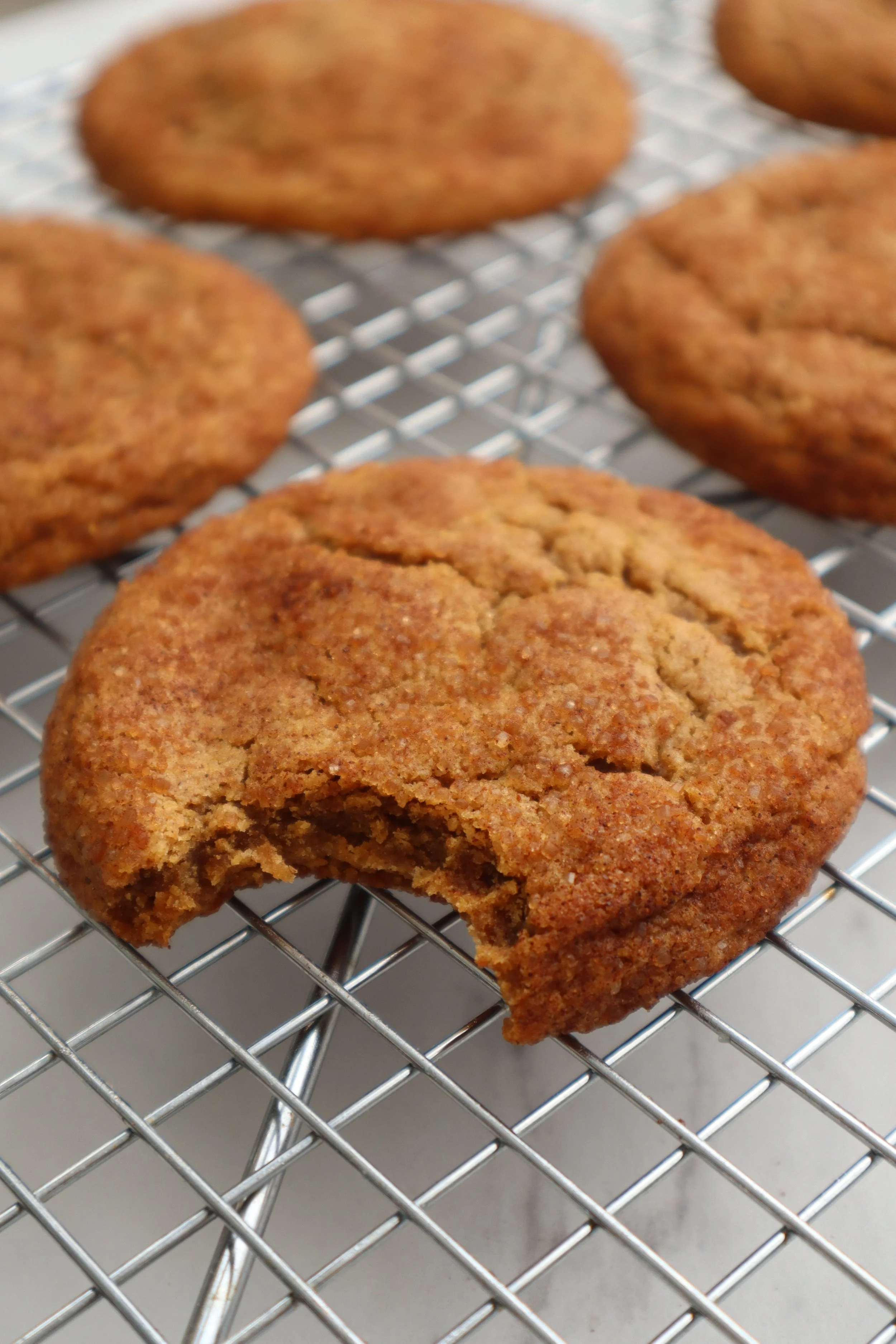 This recipe makes 6 LARGE cookies or 12 regular sized cookies (if you’re into that sort of small cookie thing…jk no judgement here). These cookies are not only delicious on the inside, but they boast a crunchy, shiny and spicy exterior thanks to the turbinado sugar and cinnamon I roll them in before baking.